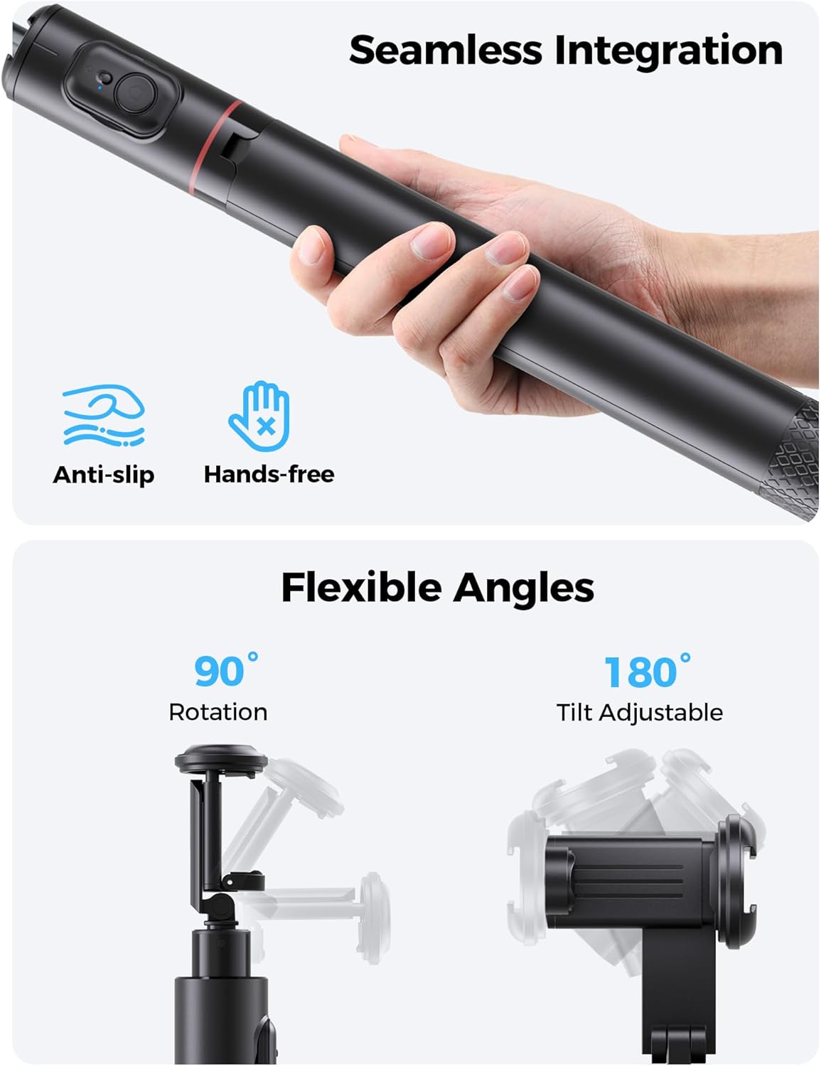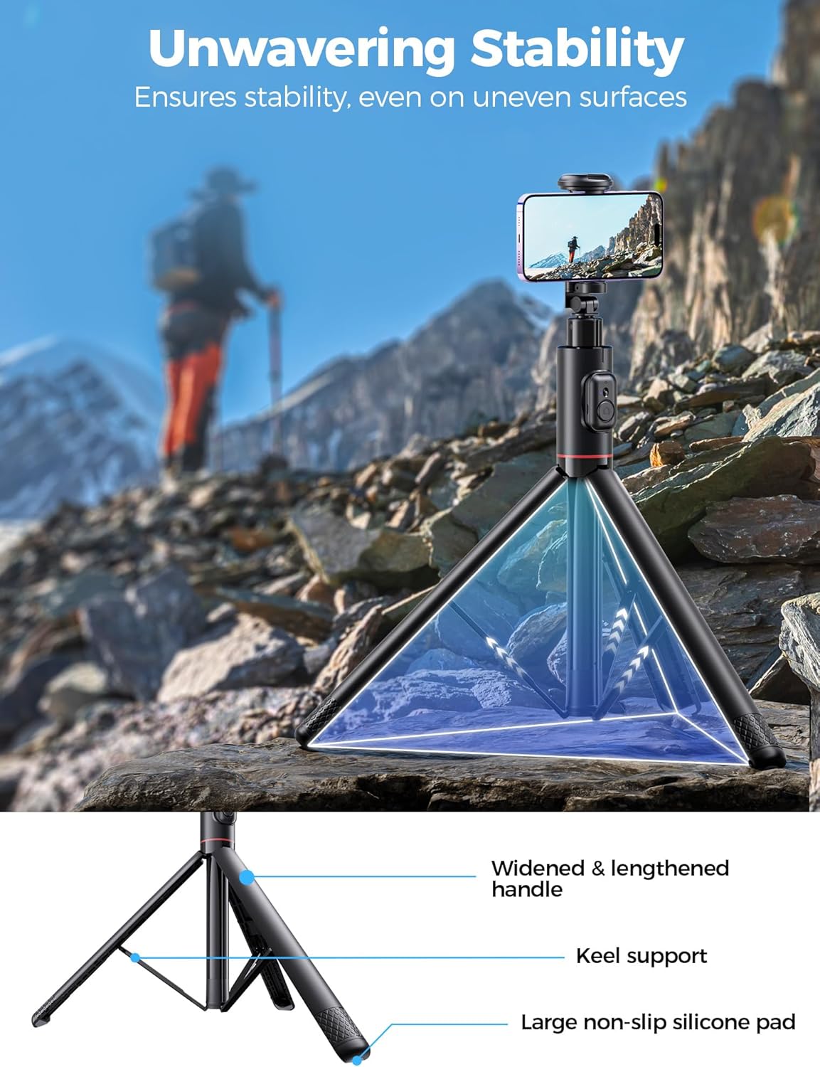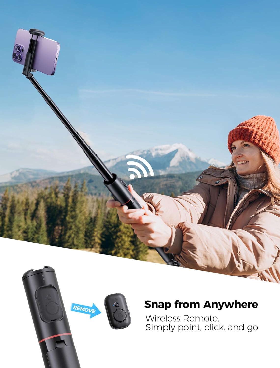 The newly upgraded reinforced base and anti-slip silicone feet ensure superior stability, whether you’re using it as a tall tripod or desktop phone stand. Featuring a wireless remote control with a 10m range, you can easily snap photos or record videos hands-free—perfect for solo adventures, group photos, or live streaming.