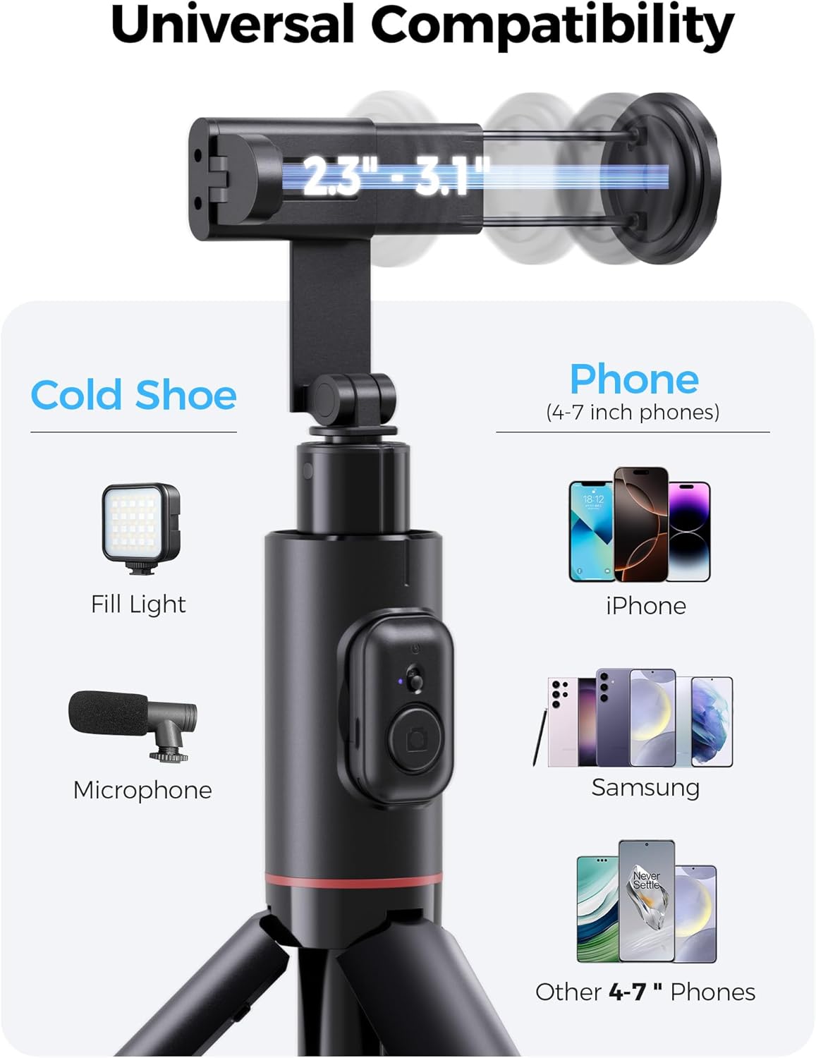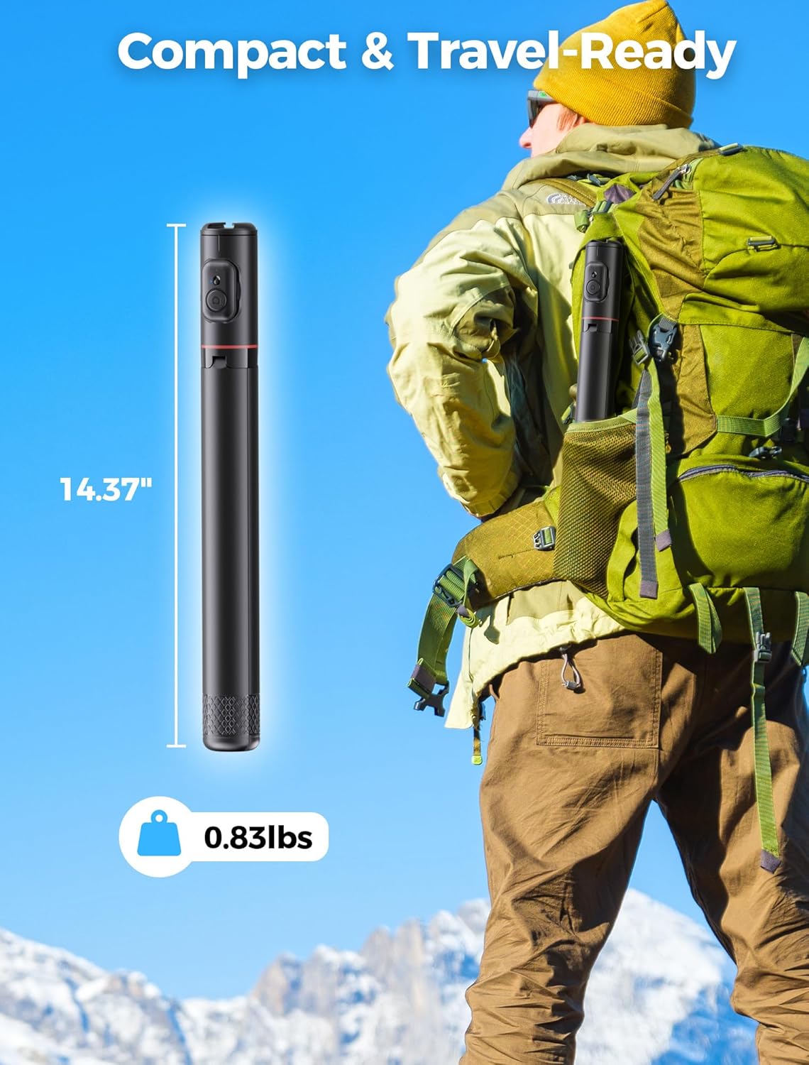 [All-in-One Tripod for iPhone] Combine the convenience of a selfie stick for iPhone with the stability of a phone tripod stand. Its foldable design (just 14.3 inches when collapsed) makes it a perfect portable tripod for travel, content creation, or hands-free video calls. Includes a universal cold shoe mount to attach selfie lights or microphones for recording