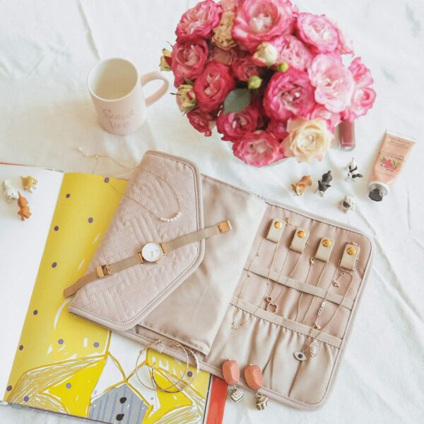 Customers appreciate the compact size of the jewelry storage bag, which is great for traveling. They find it easy to pack and slide into their backpacks. The bag has plenty of compartments for earrings, rings, bracelets, and necklaces, making it perfect for organizing a few pieces of jewelry for a short trip without having to worry about them getting lost. The color is pretty and not too pink. Many customers are satisfied with the quality of the product, describing it as well-made for daily use.