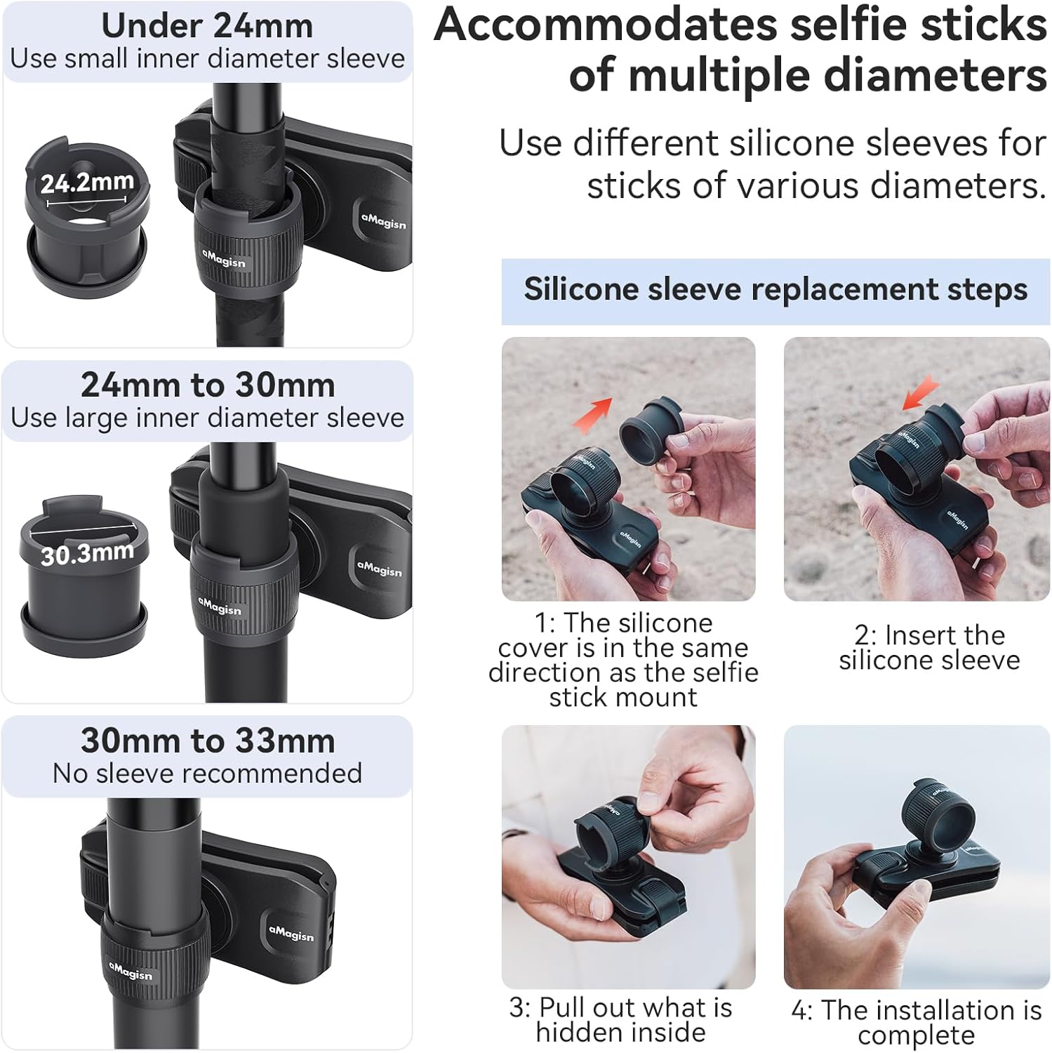 The selfie stick holder comes with two sizes of silicone sleeve,compatible with various diameter selfie sticks,also can effectively protect your selfie stick from being scratched during use