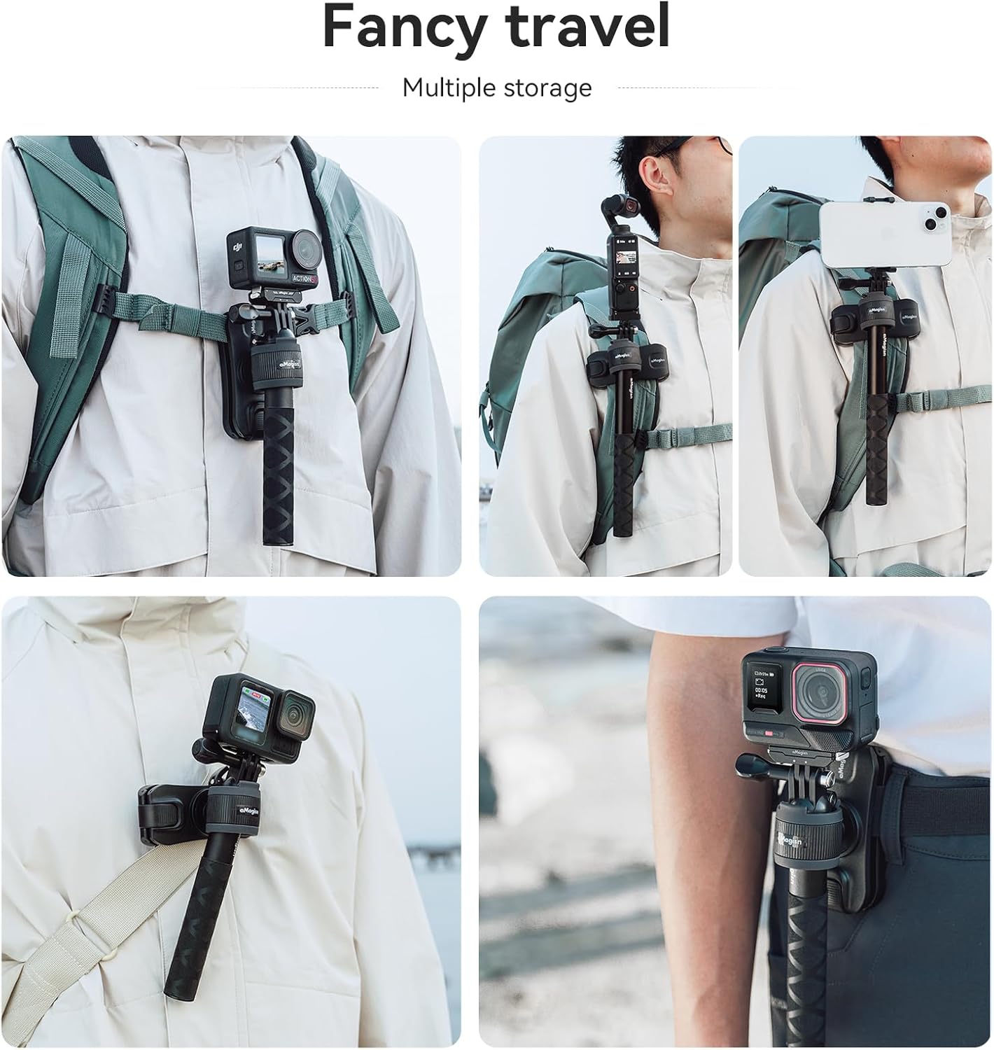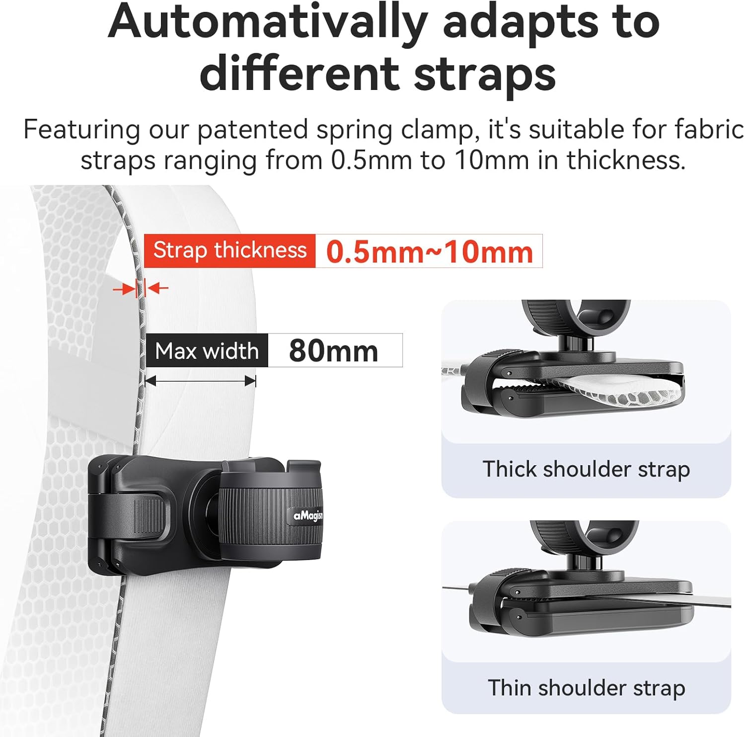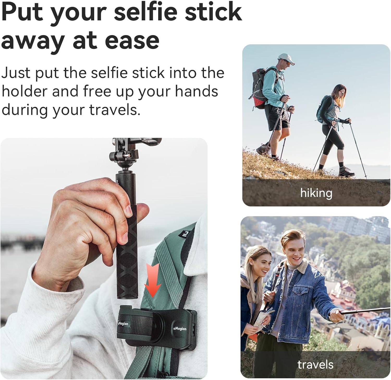 The selfie stick holder features a simple snap-on design,easily attach to a backpack strap or waist belt.And featuring our patented spring clamp,It’s suitable for fabric straps from 0.5mm to 10mm thickness