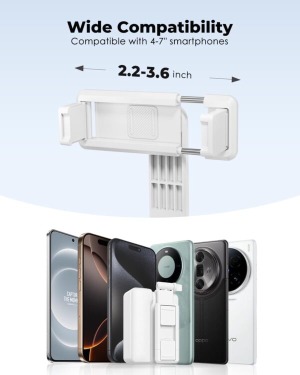 【Wide Compatibility】This multifunctional mobile phone selfie stick is compatible with smartphones ranging from 4 to 7 inches, offering excellent compatibility with most mobile phones on the market, such as iPhone 16/15/14/X/12/13/13 Plus and Pro,Galasy S10,LG G7,Ulefone Note 6,etc.The adjustment range of the pull clip is 2.2-3.6 inches, which can be freely extended and retracted. Depending on the size of your mobile phone, it securely and firmly holds your device in place.